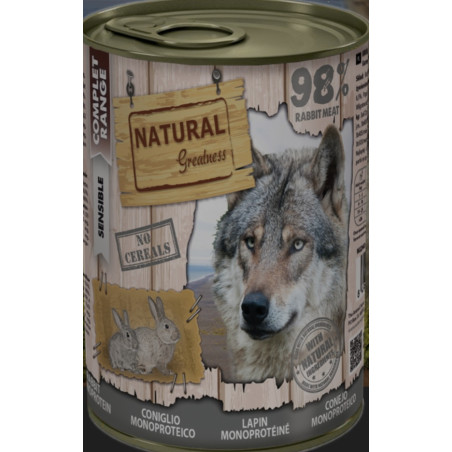 Natural Greatness RECETA MONOPROTEICA DE CONEJO es una excelente receta húmeda completa, ultra premium, monoproteica e hipoalergénica, formulada sin cereales y desarrollada idealmente para ofrecer una alimentación completa, equilibrada y de alta digestibilidad para perros adultos. Este alimento húmedo contiene un 98% de carne de conejo de alta calidad, siendo el conejo la única fuente de proteína animal presente en la receta. Es un alimento ideal para una dieta de exclusión, facilitando la detección de posibles intolerancias alimentarias o alergénicas.